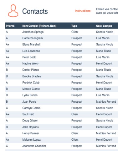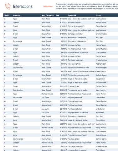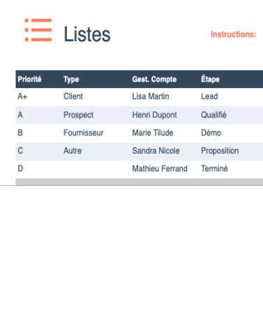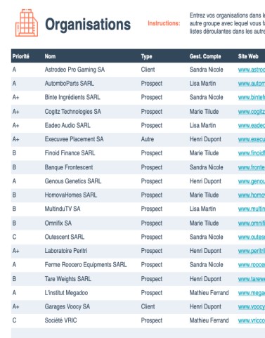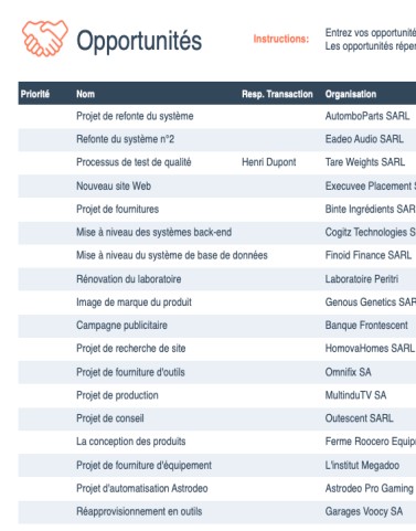 - Complétez les informations manquantes dans les onglets appelés Organisations, Contacts, Opportunités et Interactions. Assurez-vous de les tenir à jour.