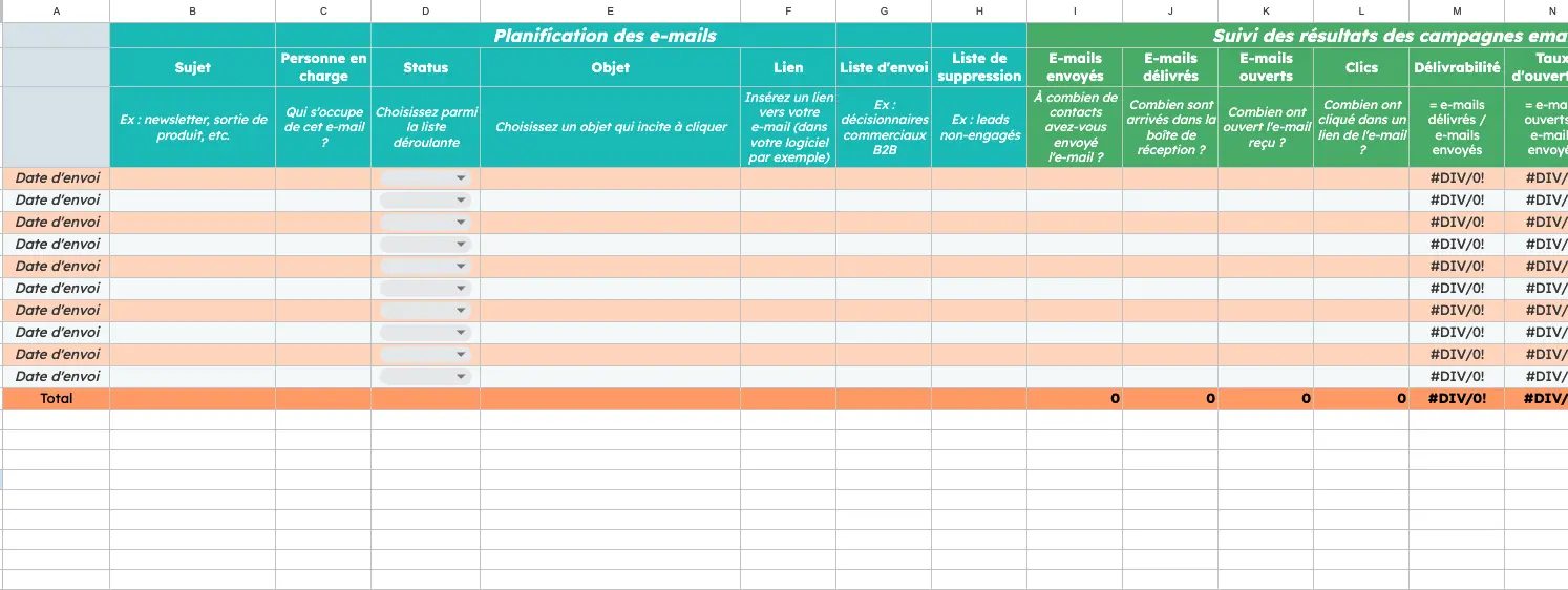 Le plan de campagne d'emailing vous sert à suivre vos différents envois d'e-mails de façon centralisée ; il prend la forme d'un calendrier éditorial qui regroupe des informations clés dont entre autres :