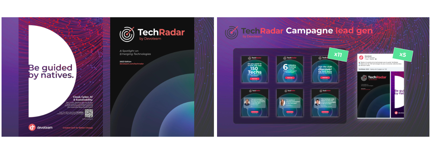 Entreprise de conseil en stratégie digitale, Cloud, cybersécurité et data, Devoteam souhaitait accroître le portefeuille clients et de talents au travers d’une campagne multicanale « Be guided by natives ». Celle-ci comprenait des publicités dans la presse spécialisée et une campagne sur les réseaux sociaux consacrée au TechRadar, un guide répertoriant 150 technologies émergentes à l’horizon du monde numérique complexe. L’édition 2023 du TechRadar est axée sur les technologies Cloud natives, étant donné que 95 % de toutes les nouvelles initiatives numériques seront construites sur ce type de plateformes d’ici à 2025. Devoteam souhaite accompagner les entreprises et les aider à accélérer leur innovation dans cette nouvelle ère.