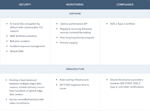 HubSpot s'engage à assurer la sécurité et dispose pour cela d'une équipe de sécurité et de détection des menaces en continu ainsi que de journaux d'activité. Avec la configuration personnalisée du réseau de diffusion de contenu, le chiffrement SSL et la certification SOC type 2, vous bénéficiez d'une protection des données fiable.