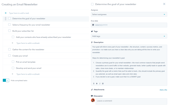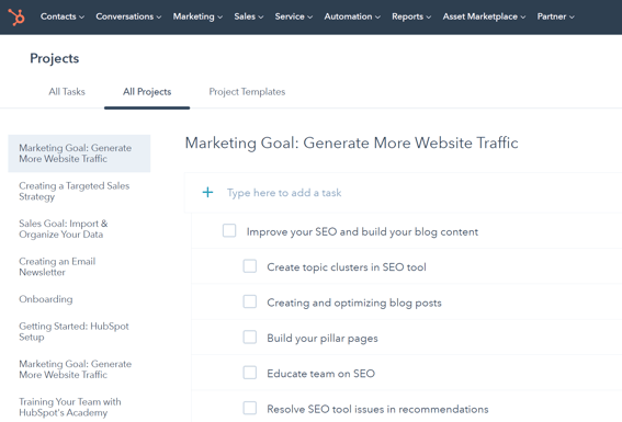Au fur et à mesure que votre équipe s'agrandit, le travail nécessaire pour mener à bien vos projets s'alourdit : planification des campagnes, attribution des tâches, respect des délais de livraison, etc. Utilisez les projets de HubSpot pour planifier et organiser le travail de votre équipe en un seul endroit avec des listes de tâches structurées.