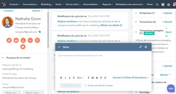 L'enregistrement des transactions est un outil conçu pour éliminer les frictions dans le processus de vente. Les outils de HubSpot se démarquent de leurs concurrents, car l'enregistrement d'une transaction crée une transaction partagée qui est synchronisée entre le portail du partenaire et celui de HubSpot. Une transaction partagée consiste en une fiche d'informations de transaction qui est créée dans le CRM du partenaire et dans celui de HubSpot lorsque cette transaction est enregistrée. Vous pouvez enregistrer une transaction partagée de trois façons : par le biais d'une bannière sur le tableau de bord des partenaires, depuis la fiche d'informations d'un contact ou d'une entreprise, ou en convertissant une transaction existante dans votre CRM.