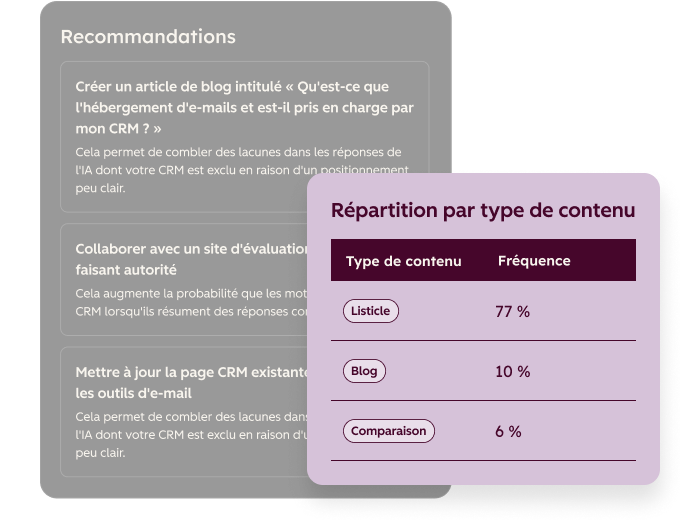 Identifiez les domaines, pages et types de contenus qui apparaissent dans les réponses IA pour votre catégorie. En visualisant ce que l'IA référence, les équipes cessent de tâtonner et produisent du contenu qui  accroît réellement leur visibilité.