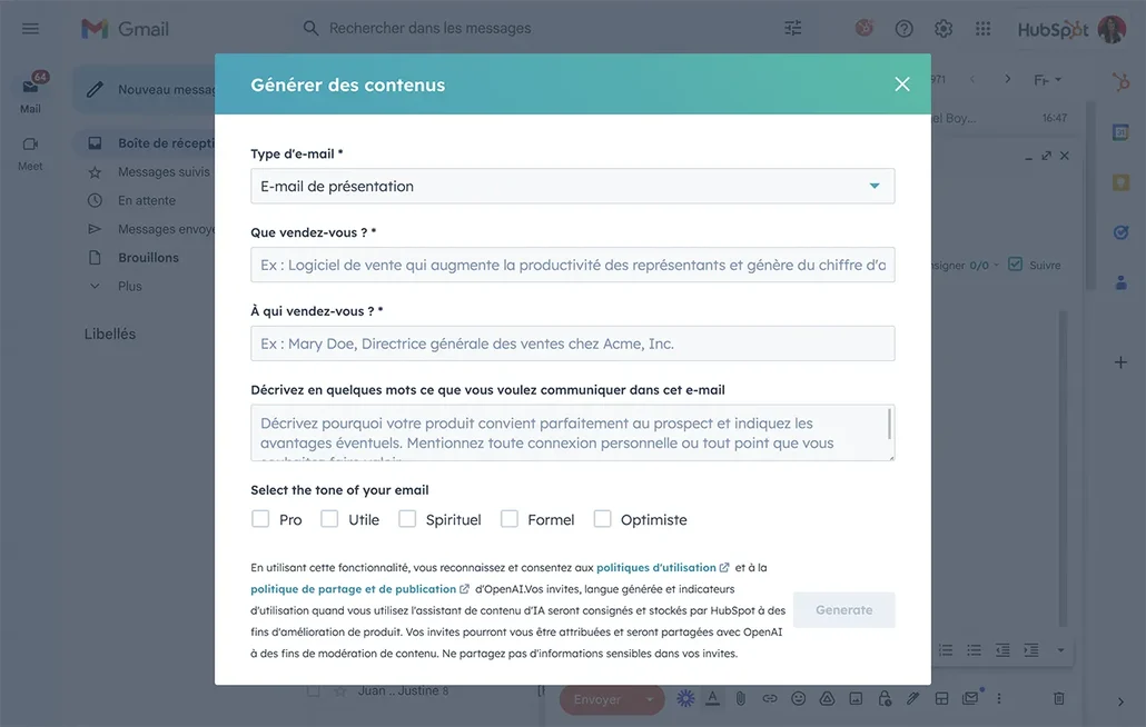 L'IA fait partie de la plateforme HubSpot. Vous pouvez l'utiliser notamment pour accélérer la rédaction des contenus, tels que les e-mails, contenus web ou de blog, ou pour générer des posts social media. Le chatbot utilise également l'IA pour informer ses réponses en fonction des données de votre site. Dans la version premium, des agents IA peuvent vous aider directement via une interface conversationnelle.