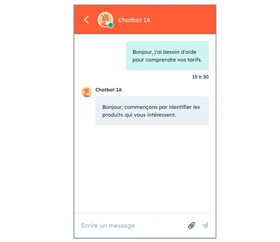 « Chez HubSpot, les chatbots sont traités comme un canal d'acquisition à part entière. Ils permettent de qualifier un contact entrant (en demandant des informationns une adresse e-mail) - le contact sera alors enregistré dans la base de données clients et scoré en fonction de son intention de vente. Il pourra ensuite être recontacté par l'équipe commerciale. »