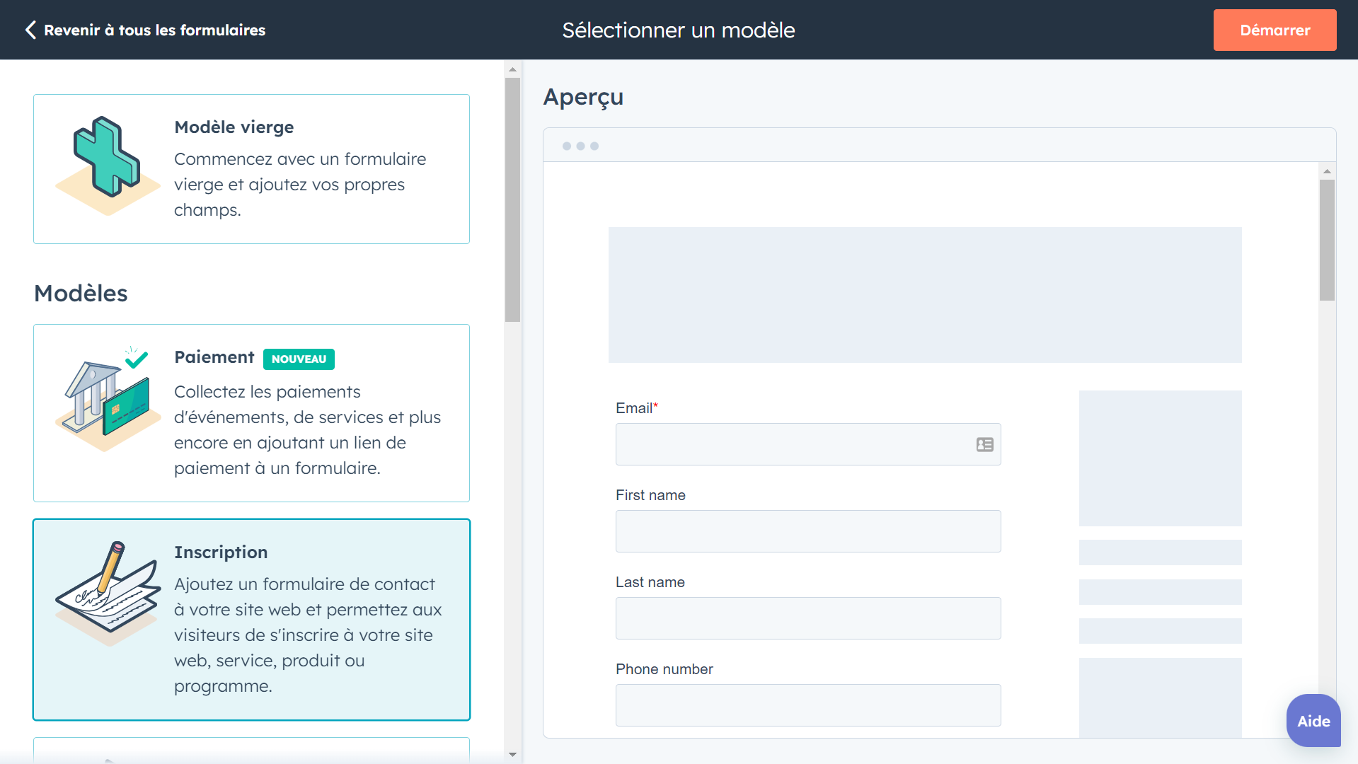 Oui. HubSpot propose un modèle de formulaire d'inscription général, un modèle pour l'inscription à une newsletter et un modèle de demande d'inscription à un événement. Chacun d'entre eux est personnalisable. D'autres modèles de formulaires sont également proposés : formulaire de contact, de demande de support client, de téléchargement d'un e-book.