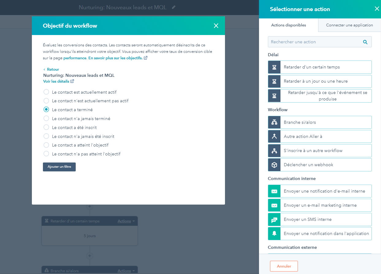 Sur HubSpot, vous pouvez définir des workflows pour gérer automatiquement vos campagnes de lead nurturing. Voici un exemple :