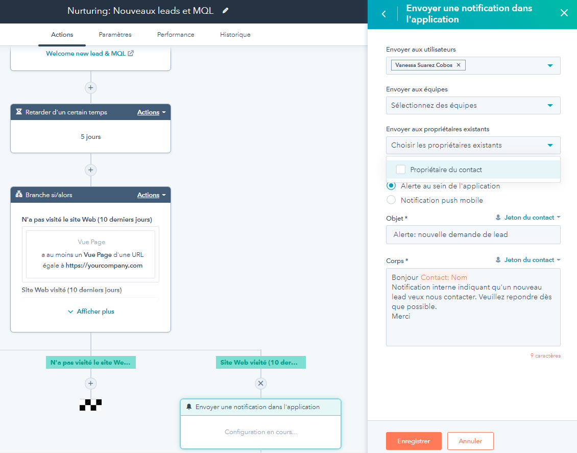 Paramétrez vos notifications pour recevoir une alerte en temps réel dans le CRM ou par e-mail lorsqu'un contact existant se rend sur votre site web. Pensez à attribuer les leads à vos commerciaux pour que le collaborateur concerné reçoive l'alerte.