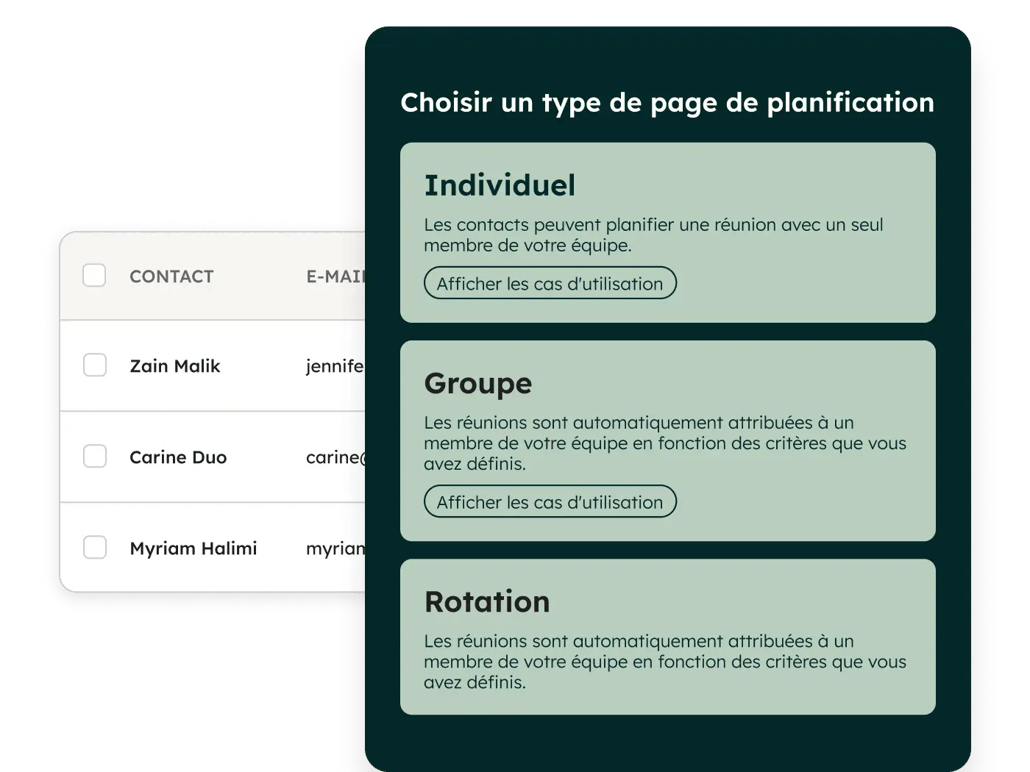 L'outil de prise de rendez-vous de HubSpot est directement intégré aux outils du CRM de HubSpot, aux e-mails marketing et au logiciel de gestion des leads de la plateforme. Il est disponible pour l'ensemble des e-mails de votre équipe.